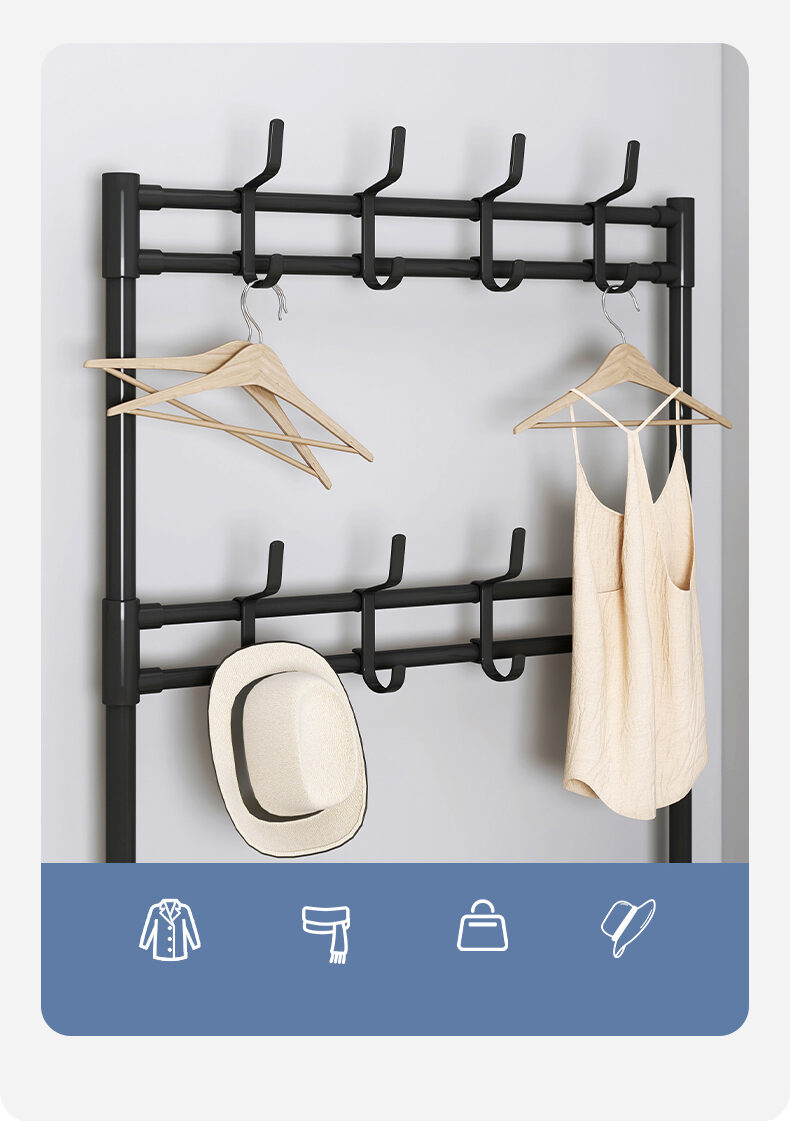 Fabriqué en fer robuste, ce porte-manteau allie durabilité et esthétique. Sa finition soignée en blanc ou noir lui permet de s’adapter à tous les styles d’intérieur, qu’ils soient contemporains ou traditionnels. Si vous recherchez une solution complète avec rangements bas, ce porte-manteau à chaussures pourrait parfaitement convenir.